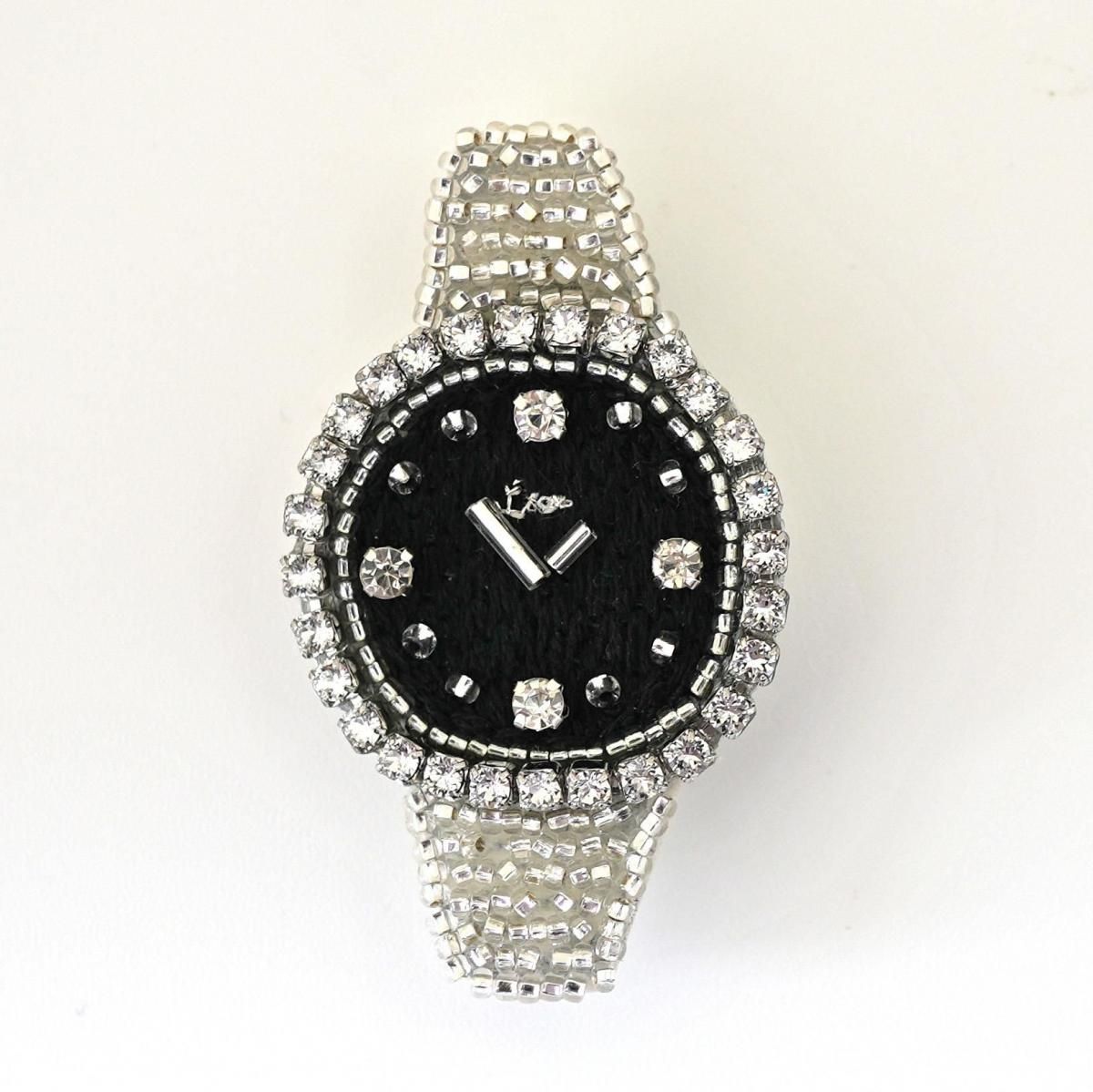 黒いフェイスの中にビーズで針や時刻が表現されており、引き締まったクールな印象のデザインです。